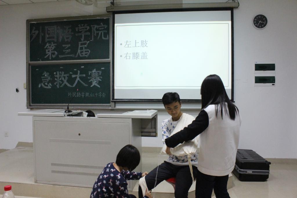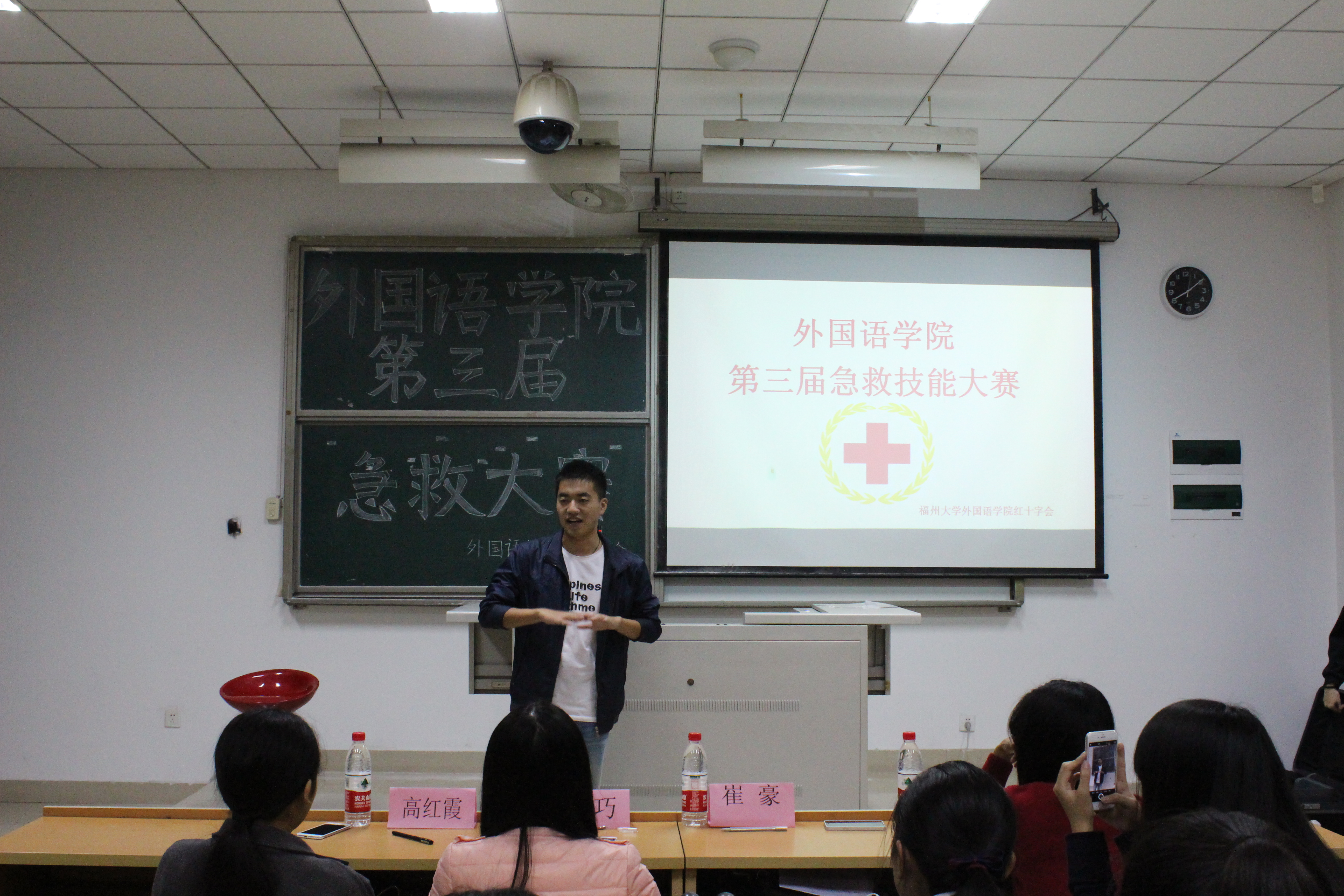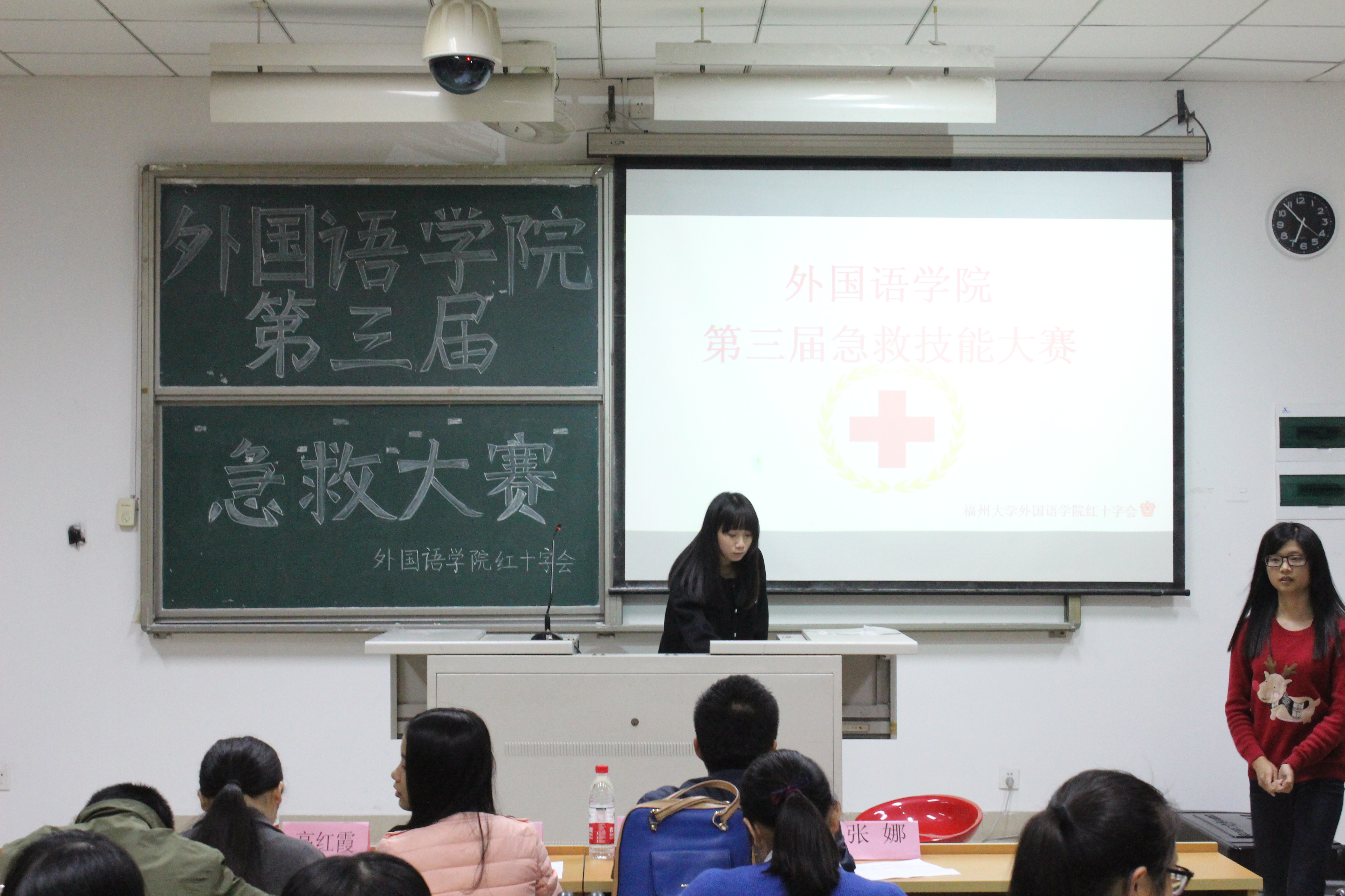 11月12日晚7时,外国语学院第三届急救大赛在文1-103举行,本次大赛由外国语学院红十字会举办,由院红十字会前任会长王巧、现任会长张娜担任评委。