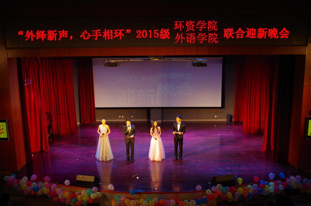 11月10日晚,由外国语学院、环境与资源管理学院共同主办的“外绎新声,心手相环——2015年外院、环资联合迎新晚会”在博学厅隆重举行。出席本次晚会的嘉宾有外国语学院党委倪朝兴书记,外国语学院党委周强副书记,环资学院院党委蔡剑英副书记,外国语学院团委书记林昕老师,环资学院团委黄永斌老师以及各位辅导员老师。