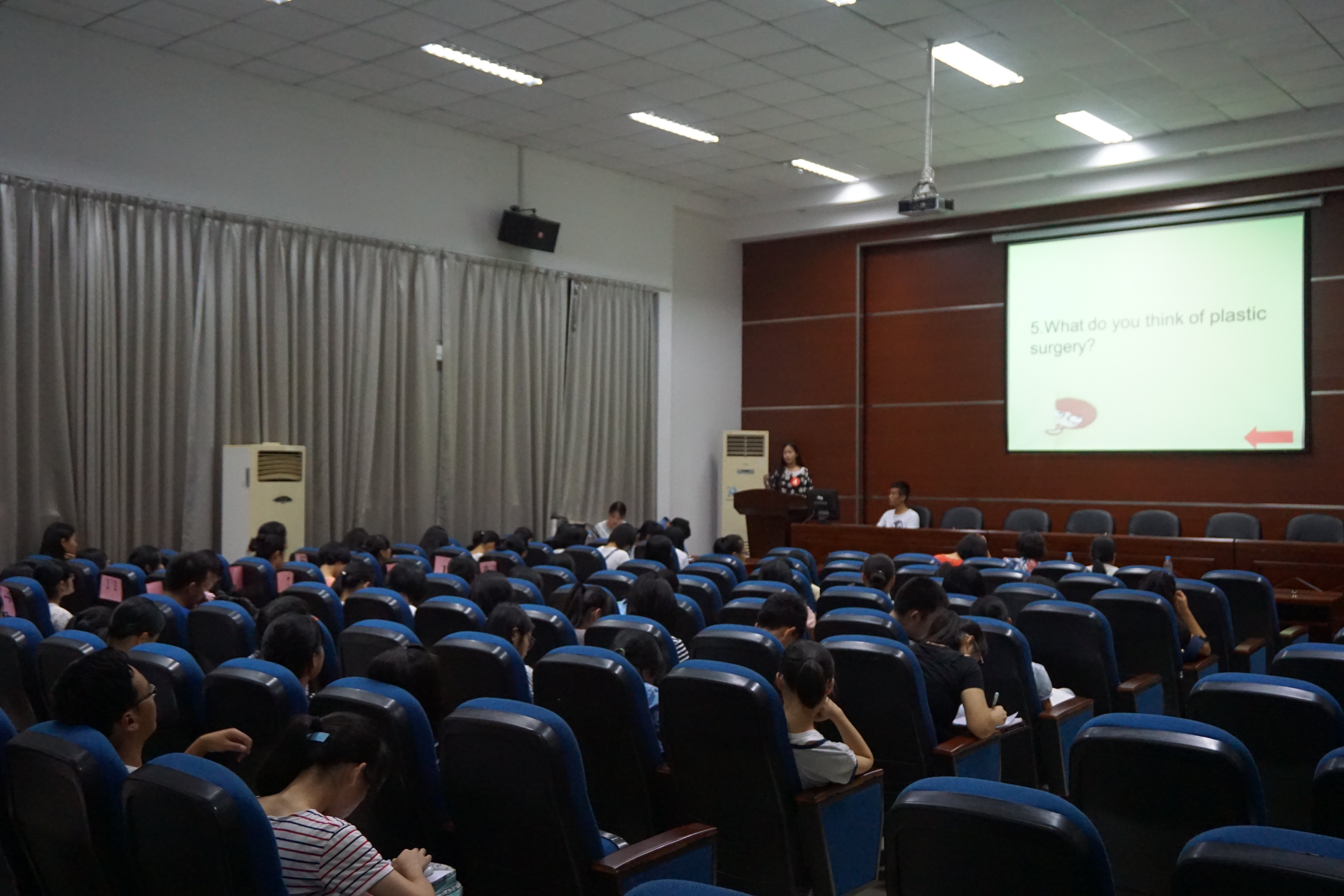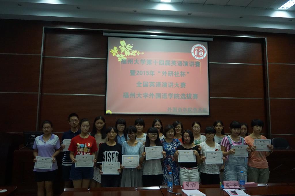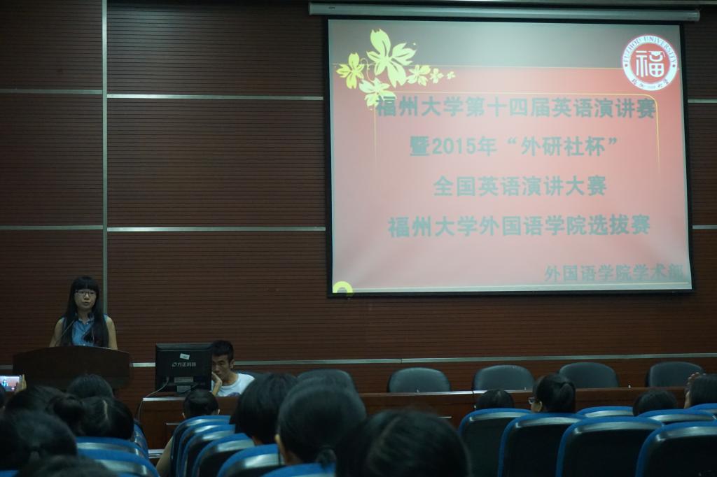 第十四届英语演讲比赛暨2015年“外研社杯”全国英语演讲比赛外国语学院初赛在院办会议室举行。本场比赛邀请了梁向辉老师、戴力芬老师、付磊老师担任评委,并有17位学子积极参与,吸引了大量观众到场观看。