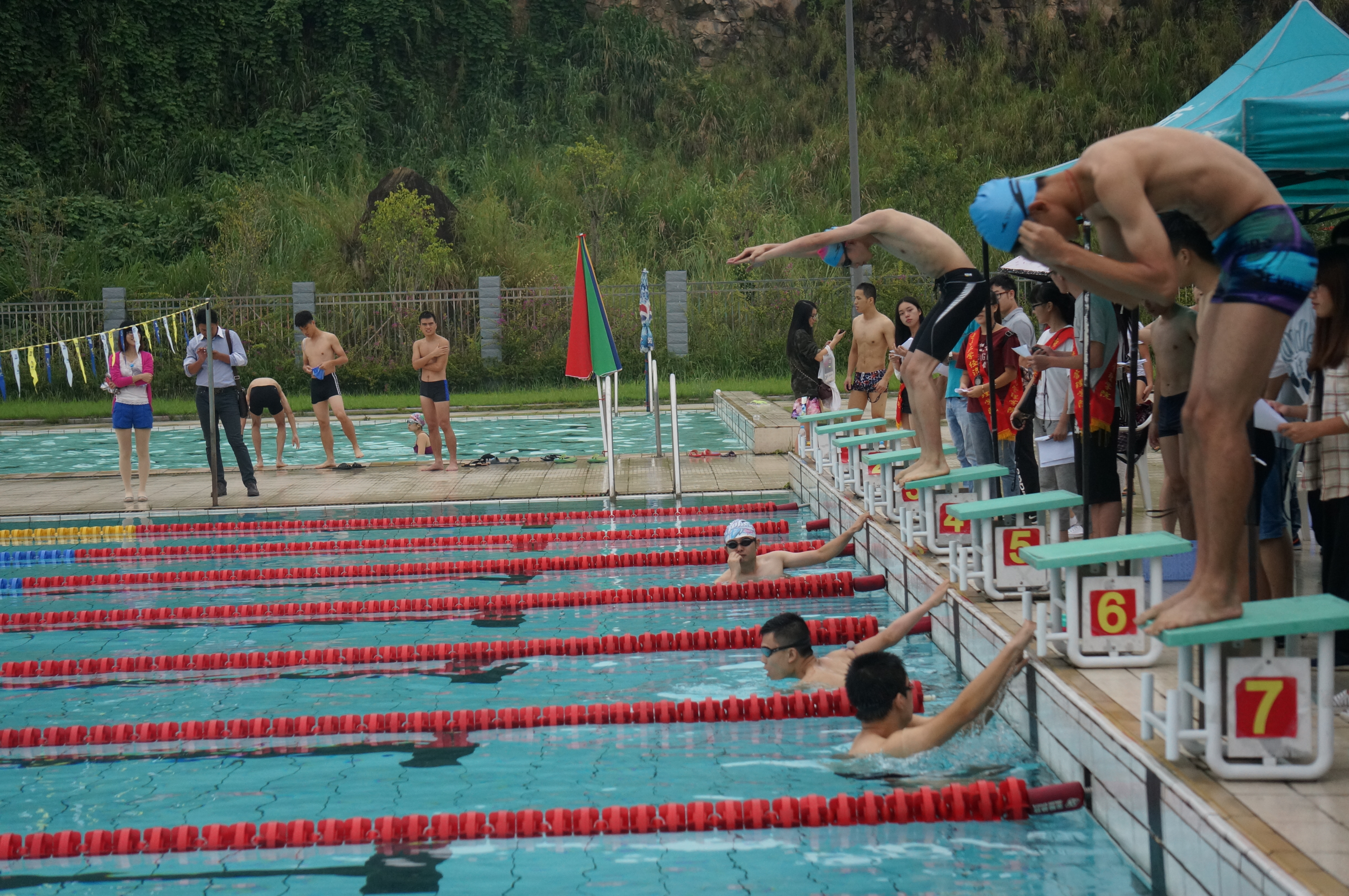2015年学生游泳比赛在三区游泳馆举行。本次比赛项目分个人赛和团体赛两种,包括50、100、200米自由泳,蛙泳,仰泳,蝶泳等十项个人赛及男子、女子4*50混合游、自由泳等四项团体赛。外国语学院派出男子、女子代表队共8人参加本次比赛。