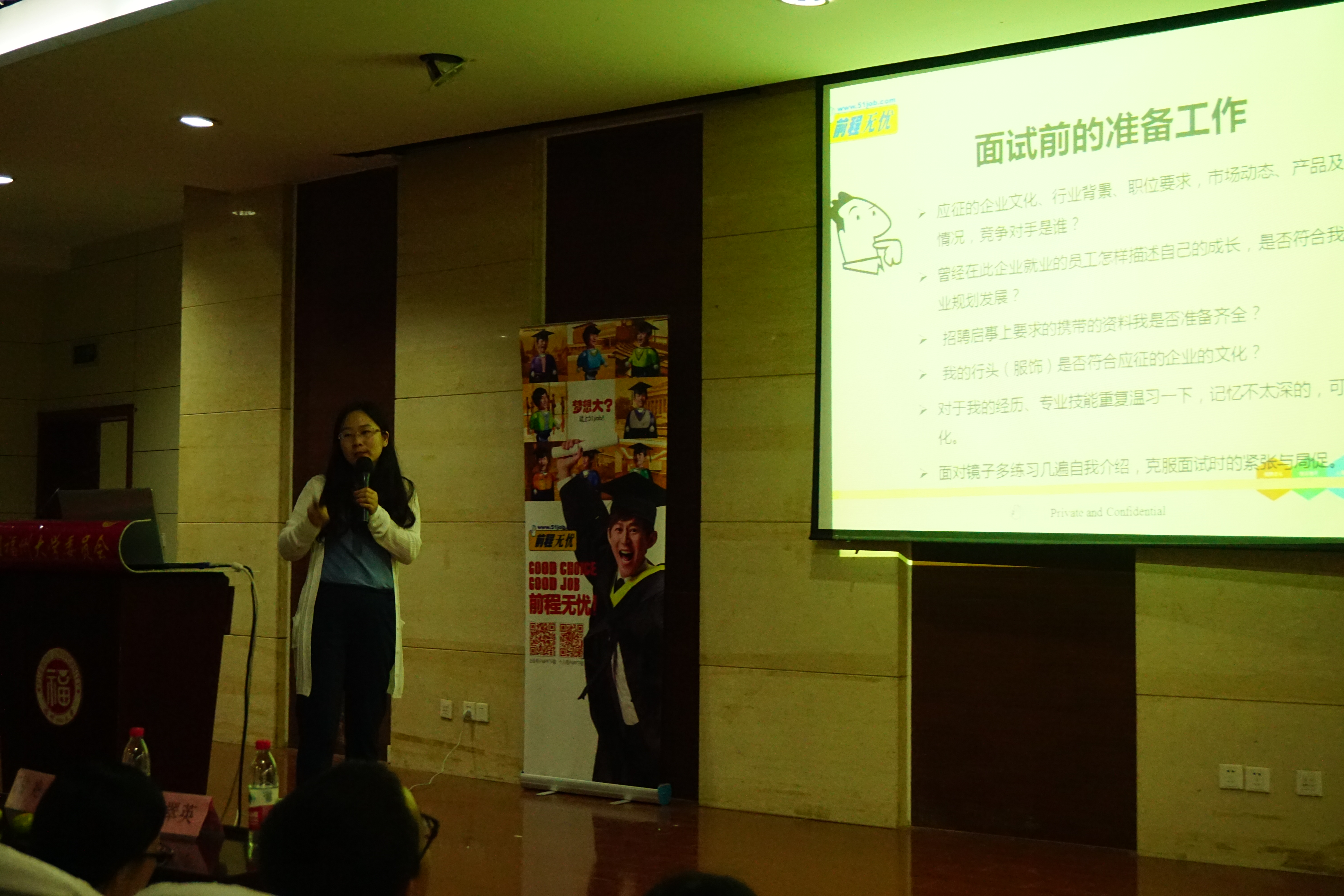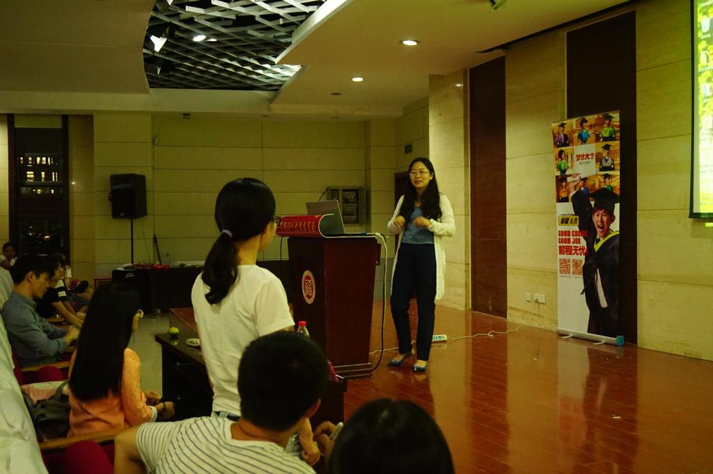 素质拓展中心学术报告厅拉开序幕。此次讲座由前程无忧的高级经理甘艳老师主讲,甘艳老师以其在人力资源从业十多年的丰富经验及对现代就业形势的缜密分析,为在场的莘莘学子答疑解惑。