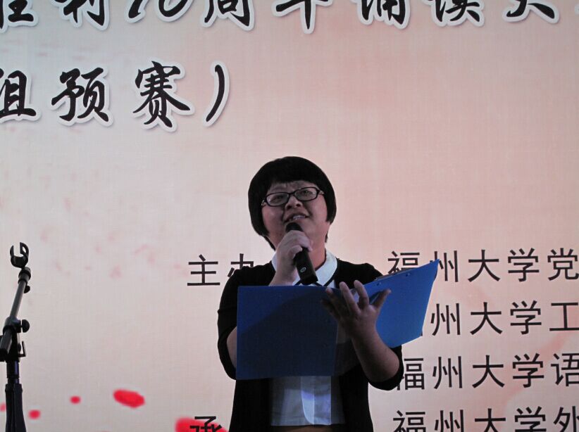 此次大赛有幸邀请到校工会常务副主席倪朝霞、党办校办副主任魏金明、福建省朗诵协会理事人文学院董海峰、社科处副处长程贞玫和校工会文化部副部长饶春华等领导们前来担任评委,由外国语学院林菲老师担任主持人。