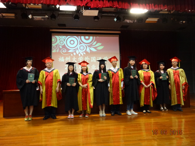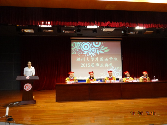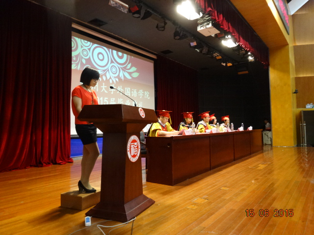 外国语学院2015届毕业典礼在图书馆明德厅圆满举行。外国语学院党委书记倪朝兴老师,院长潘红教授,党委副书记周强老师,副院长王平副教授、钟晓文副教授及外国语学院各系部分教师、2015届毕业生、部分学生家长参加此次毕业典礼。此次典礼由周强副书记主持。