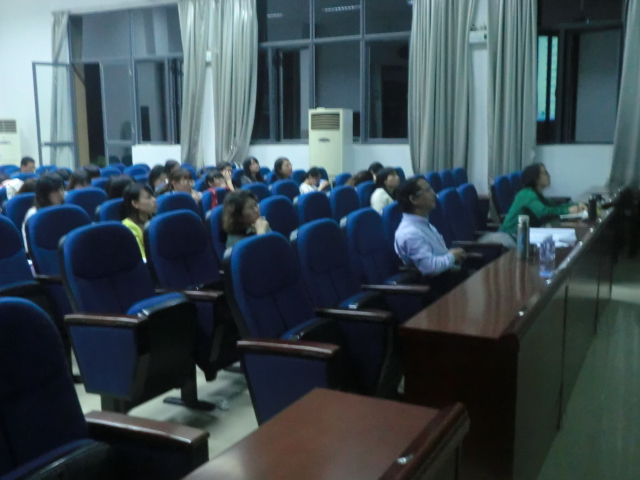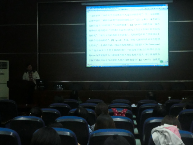 殷教授一进场就以幽默的口吻赢得了同学们的阵阵掌声。接着,他从两个部分向在座的听众全面而生动地介绍了华兹华斯笔下的共同体情怀。首先他详细解释了什么叫做共同体。他指出,共同体是生机勃勃的有机体,是我们的社会结构,社会基础。在华兹华斯笔下体现在一种深度沟通的共同体情怀。第二部分,他提出了华氏笔下的“对陌生人的深度关怀”,并说明只有在深度共同体中,沟通才成为可能。殷教授形象的讲述让同学们迅速得以理解。