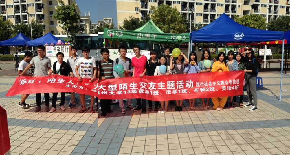 外国语学院13级英语4班学生携手13级法学1班,车辆工程2班,紫金资源勘查1班在福大生活一区青春广场附近开展“你好,陌生人”团立项活动。此次团立项通过组织陌生人一起组团玩游戏,拥抱爱心布偶等形式,引导彼此陌生的同学之间消除隔阂,消除冷漠,将同学们凝聚在一起。