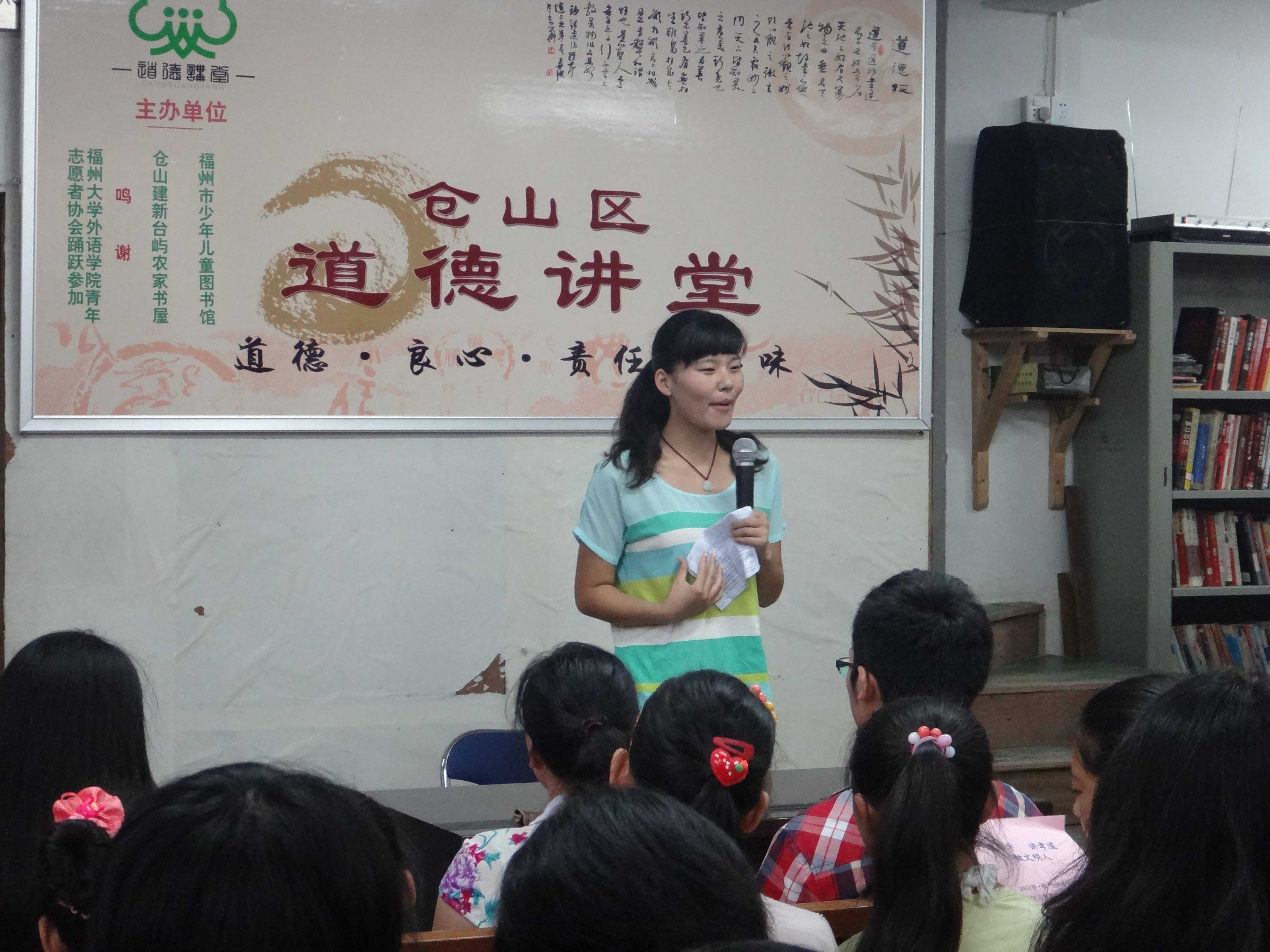 外国语学院青年志愿者协会携手台屿村农家书屋,开展“学国学,讲孝道,做文明人” 为主题的道德讲堂活动。志愿者刘芸云首先做了主题为“传承孝道文化”的发言,使在场的同学们对于新世纪孝道美德的定义有了更加深刻的了解;接下来,一小女孩背诵《弟子规》,两名中学生代表讲述有关二十四孝的小故事,体现了传统文化以及美德在少年儿童中的传扬;而后,志愿者王路平进行的演讲及古稀老人的演奏将活动推向了高潮。一位乡镇领导干部对于青少年的道德以及修养的做了评价与期望,体现了老一辈的期望;最后,林家荣以一首《愚公移山》作为压轴节目,活动落下了帷幕。