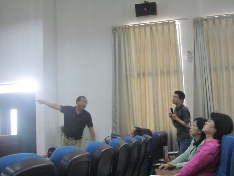 在钟晓文副院长简短介绍郑新民教授后,讲座正式开始。本次讲座主要分为三个部分:翻转课堂、移动学习与外语教学研究。首先,一个大约5分钟的视频呈现了我们所处的大数据时代的总体特征:快速的信息更新,紧密的互联网关联,正在改变的学习生活方式。郑教授在比较传统与现代课堂中,讲述了翻转课堂的特殊性及其独特魅力,介绍了融合了传统课堂的“混合式教学”,比较了国内教学与国外的教学模式。郑教授通过视频,向大家介绍了“短、小、精、悍”特点的微课。在学习方法发生变化的今天,微课发展势头迅猛。最后,郑教授重点介绍了大数据时代的外语教学研究,通过大量直观的图例,呈现了研究选题、文献查找、研究方法等方面的线路图,并强调了哲学观的重要性。在讲座中,郑教授不时与老师、同学们交流看法,并用生活实例说明问题,提出新的教学研究方式,老师同学们都受益匪浅。