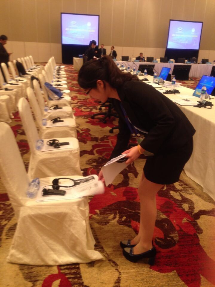 外国语学院的11名青年志愿者在2014年APEC财政高官会的岗位上开始了忙碌的志愿服务工作。11名志愿者从上午7:00上岗,一直工作到当晚22:00,为来自21个经济体的财政高官、25个国际机构的代表以及国内部分省市财政部门代表进行志愿服务。志愿者们各司其职,会场支持组的志愿者主要负责会议室的布置,话筒、音响及灯光等设备的调试和幻灯片的播放操作。而主要活动支持组的志愿者在引导经济体财政高官和国际机构代表合照、茶歇时则必须做到高效快捷无缝衔接。双边会见组的志愿者主要负责陪同官员进入会议室,进行双边交流会议。此外,机场组、注册台的志愿者全天站岗,负责接送官员和官员注册等工作;文件印制组的志愿者负责会议材料的打印、领取和分类。