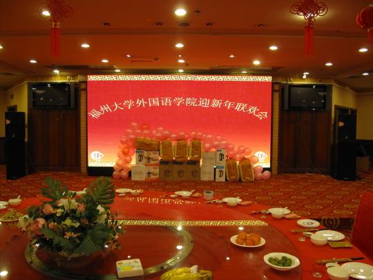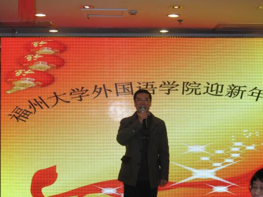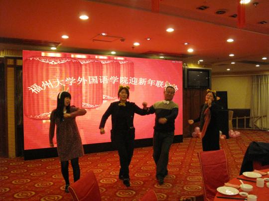 的外籍教师们也不甘示弱,日语系几位外教老师集体登台,一出名为《四大美人秀》的表演载歌载舞,令人莞尔。最后表演的学院全体工会干部,伴随着动感的音乐,他们跳起了目前红遍全球的《江南style》,炫酷的黑墨镜,经典的骑马舞造型,夸张的动作,让全场的气氛high到极点。最后学院倪朝兴党委书记和陈小慰院长分别致新年贺词,联欢会在温馨和谐的气氛中圆满结束。