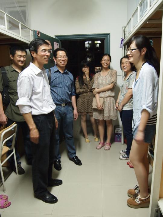 首先他们对学生公寓的各个楼层宿舍的卫生情况进行随机的抽检,同时对宿舍的设备提出一定的评价和建议,交代学生在宿舍期间应特别注意宿舍安全问题,并提出安全建议。在此期间,院领导们还回忆起几年前的宿舍情况,感慨现在大学生的生活条件在不断的改善。走访期间,领导们还与学生进行简短的交流,从而更加了解学生住宿和活动情况。接着,他们参观各个楼层的活动室。与此同时,倪朝兴书记对活动室的设计和布置,以及外国语学院的一些常规设施进行进一步的了解,并提出建议。他表示,在党建活动室可以增加书刊以及一些有益读物。