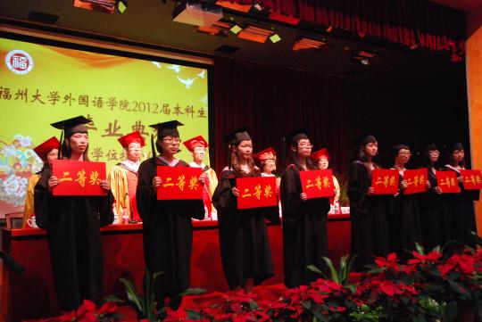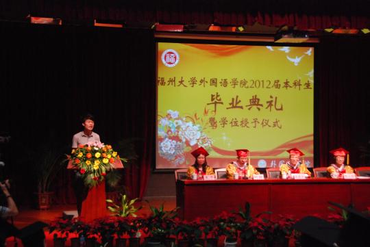 330分许,毕业典礼在庄严的国歌声中拉开序幕。首先,由倪朝兴书记为毕业典礼致辞。他表示,虽然毕业生们即将走出这所校园,但这不是终点而是新的起点。他希望毕业生们继续发扬福大人精神,并向毕业生们表达了自己的殷切期待及衷心的祝福。随后,陈小慰教授登台发言。她表示在这四年里老师与学生们共同成长,相互学习相互帮助,彼此间受益匪浅。她激励毕业生要勇敢地面对生活的挑战,在今后的道路上奋勇不息地追逐自己的梦想。紧接着,潘红副院长宣读外院优秀毕业生名单和获考研保研奖学金学生名单,并为他们颁发校优秀毕业生证书。在教师发言这一环节中,老师代表们依次用英、日、德三种语言向大家表示毕业的祝贺及对未来的祝福,赢得了同学们热烈的欢呼和热切的回应。紧随学生代表发言之后,毕业生全体庄严宣誓,在师长面前表达自己回报社会的坚定信念和决心。典礼最后,学院领导为毕业生授予学位证书,拍照留念。典礼在欢乐声中闭幕。