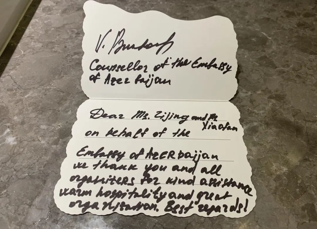 此外,阿拉伯叙利亚共和国驻华大使馆文化事务负责人法迪·瓦苏夫 Fadi Wassouf、阿塞拜疆驻华大使馆政治参赞帕那哈夫·乌格尔也对2019级笔译专业研究生黄紫菁、2020级笔译专业研究生王子葳表示感谢。