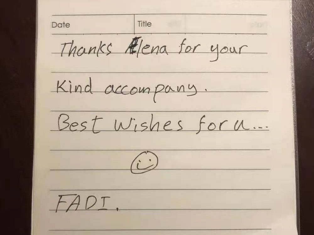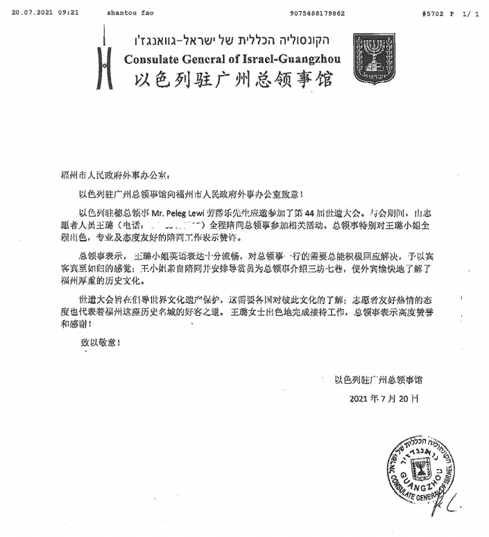 在感谢信中,以色列驻穗总领事Mr.Peleg Lewi劳霈乐先生特别对王璐同学全程出色,专业及态度友好的陪同工作表示赞许。总领事表示,王璐同学英语表达十分流畅,对总领事一行的需要总能积极回应解决,予以宾客宾至如归的感觉,使外宾愉快地了解了福州厚重的历史文化。志愿者友好热情的态度也代表着福州这座历史名城的好客之道。