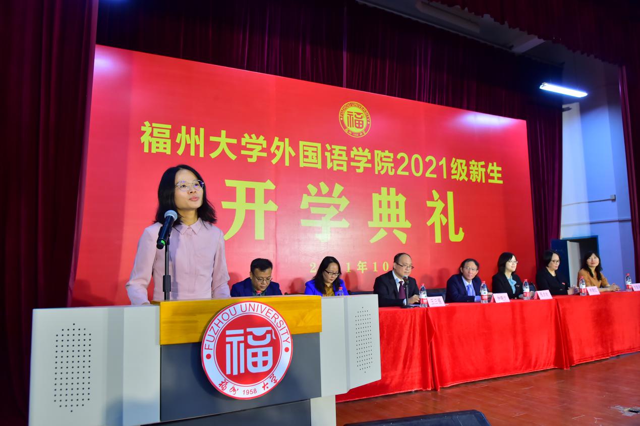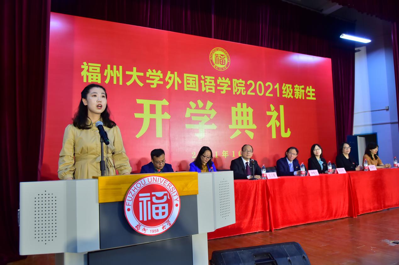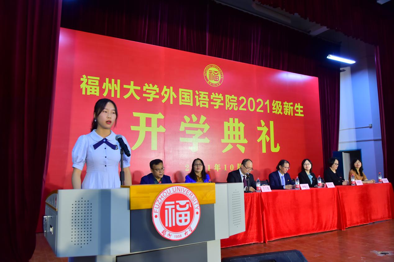 本科生新生代表张源乐同学、研究生新生代表王旭薇同学先后上台发言。张源乐同学为自己能够来到福大而感到自豪与骄傲,她说道:福大学子应当时刻将“明德至诚、博学远志”的校训铭于心,施于行,共同迎接挑战、勇克难关,拥抱崭新的大学生活。王旭薇同学表示作为一名新生福大学子,我们更应当牢记外语学子的使命,拥抱机遇、迎接挑战,讲好中国故事,传递中国声音。
