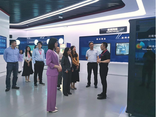 领导从学院的办学理念,教学策略,人才培养模式等方面与企业开展交流,促进双方了解,为校企合作奠定基础。此外,郑通燕经理为参会人员们讲解锐捷海外业务现状,以及具体的岗位分类和需求。最后,在胡凯强先生的带领下,全体人员参观了锐捷“体验中心”,并进行合影留念。