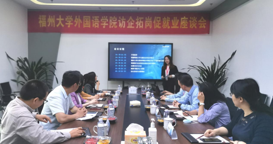 为拓展就业新空间,破解学生就业难题,5月13日下午,外国语学院党委书记程贞玫,院党委副书记蓝荣聪,院长助理甘振翎,英语系主任陈建华,日语系主任金玉花,德语系副主任王晓霞,院团委副书记唐斌湖一行赴锐捷网络有限公司开展交流座谈会。座谈会于锐捷网络4楼会议室及体验中心进行,双方就企业发展情况、人才招聘需求等方面展开讨论。
