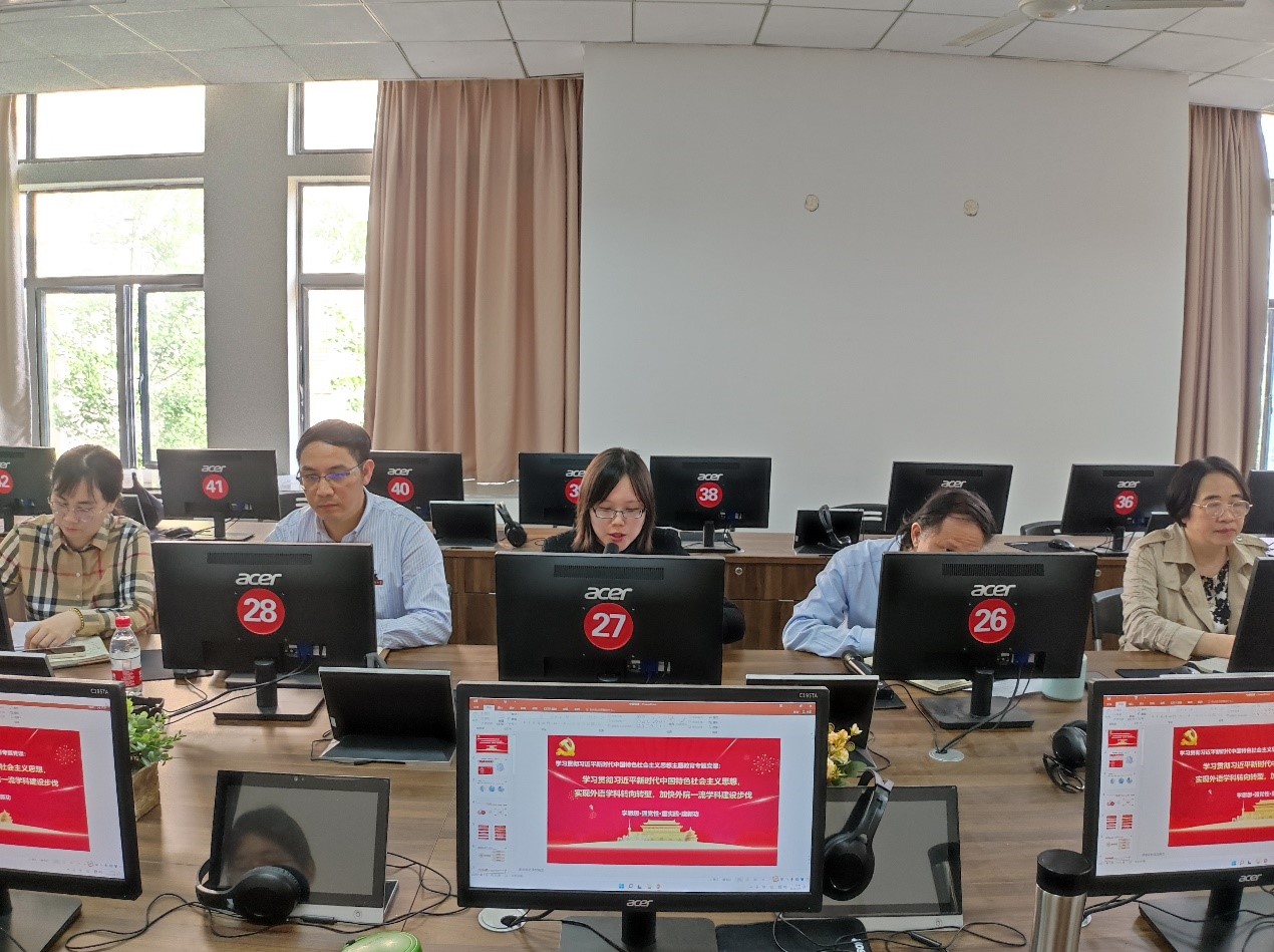 钟晓文院长的专题党课聚焦主题教育总要求,结合自身学习党的二十大报告体会,围绕增强中华文明传播力影响力,深入阐释了习近平新时代中国特色社会主义思想的丰富内涵。他指出,习近平新时代中国特色社会主义思想是中华文化和中国精神的时代精华,是新的历史条件下推动发展的科学指引。学院必须学习贯彻习近平新时代中国特色社会主义思想,以平台和项目为抓手,加强内涵建设、学科特色建设,紧扣外语学科语境需求使命,推进学院教学转向、专业转型升级,实现外语学科融家国情怀教育、国际化人才能力培养、数字技术运用、国际传播能力提升为一体的范式探索。全院党员干部要学懂弄通做实习近平新时代中国特色社会主义思想,牢记“为党育人、为国育才”初心使命,坚定落实立德树人根本任务,不断提高履职尽责的能力和水平,要“敢”字当头、敢为善为,大胆实践、大胆探索,努力加快学院一流学科建设步伐。