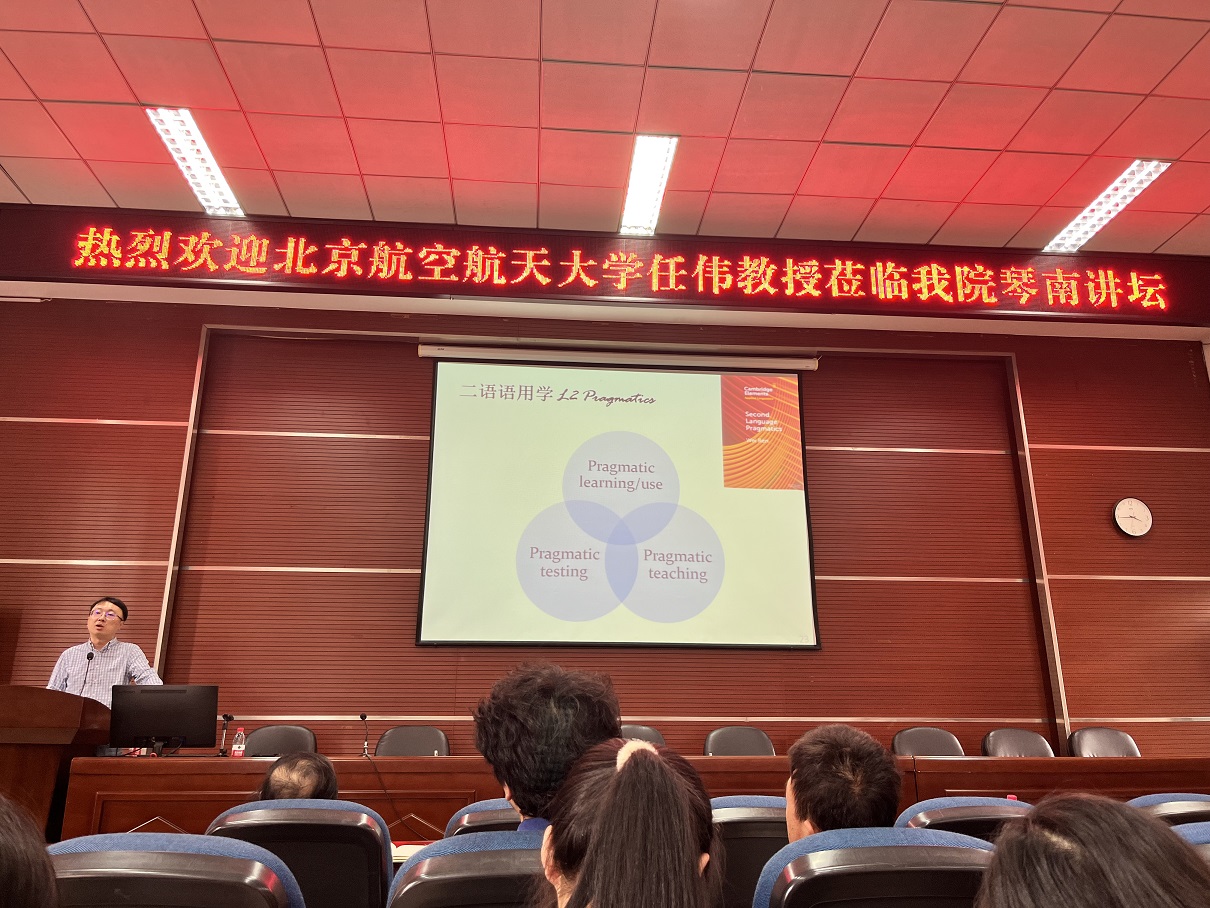 ,担任本期琴南讲坛主讲嘉宾,讲座题为:“学术期刊论文选题、写作与发表”。讲座在外国语学院三楼大会议厅举行,由外国语学院院长钟晓文教授主持,近百名师生参与,座无虚席。