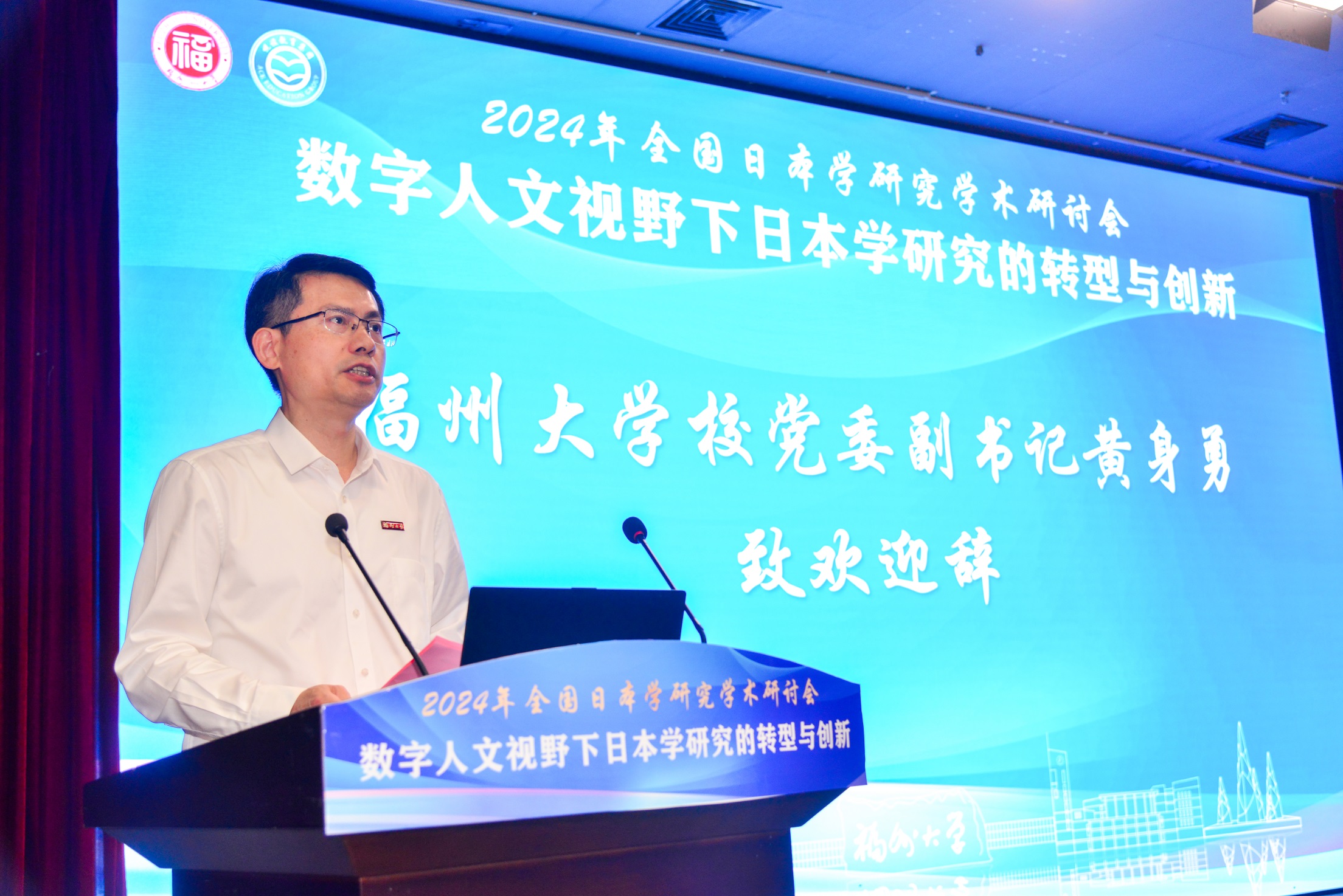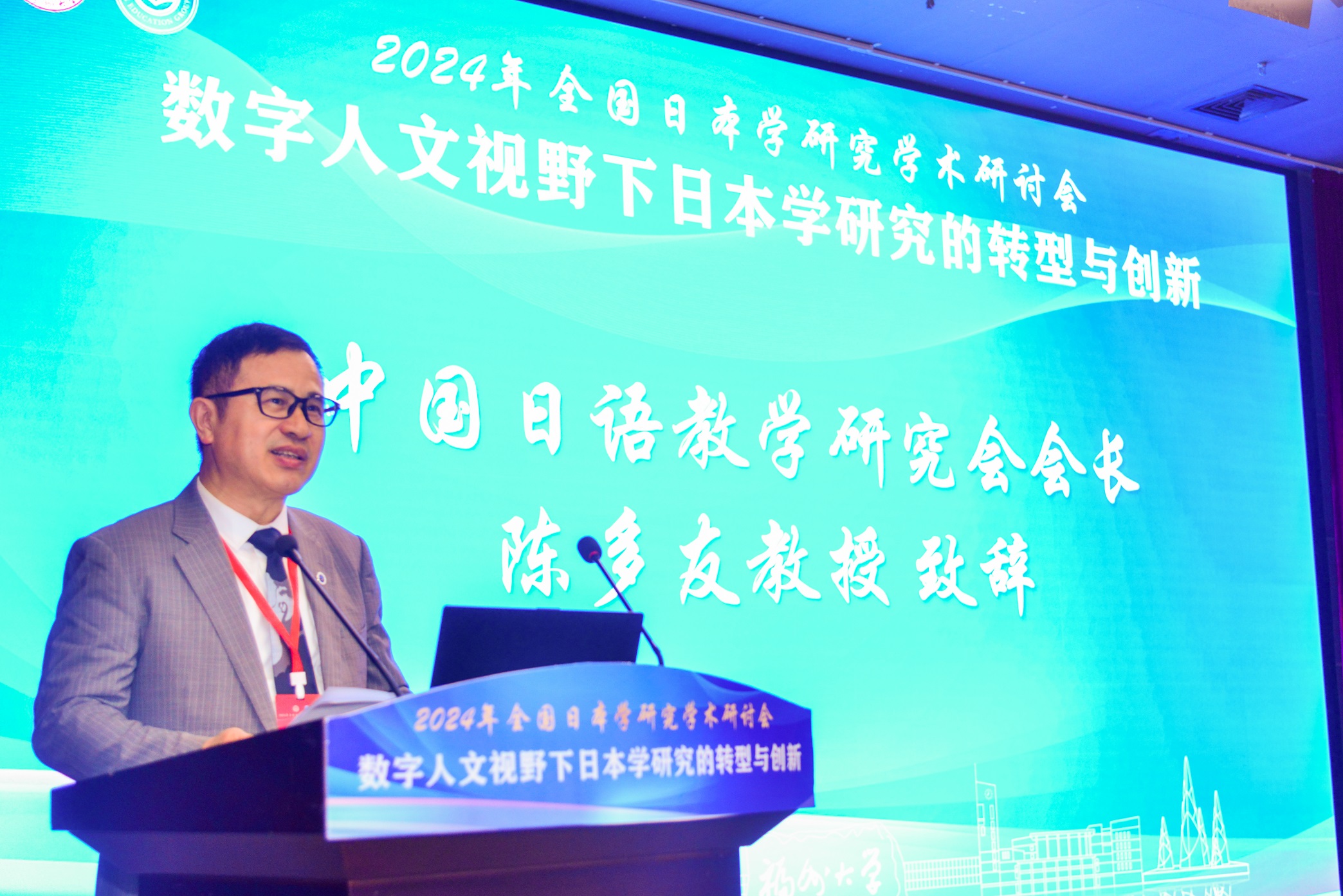 精心承办此次研讨会表示感谢,对出席大会的全体代表表示欢迎。中国日语教学研究会会长陈多友教授代表中国日语教学研究会,希望通过此次研讨会,各位学者能够分享研究成果和宝贵经验,深入探讨数字人文视野下日本学研究的新方向、新方法和新路径。