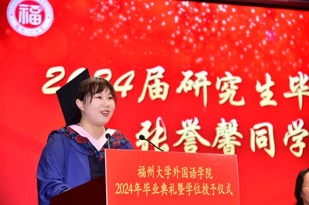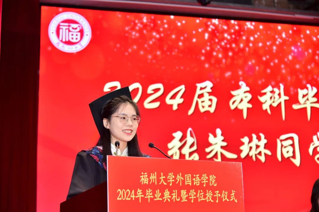 张朱琳同学首先向学院、老师及亲友表示感谢,接着回顾自己四年的学习生活,表示会遵循习近平总书记的殷切嘱托,努力成为国家需要的大有可为的外语人才。最后表达对母校、师长及同学的美好祝愿。