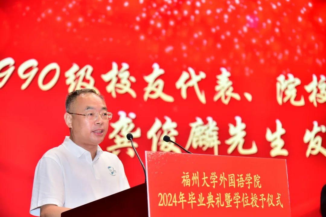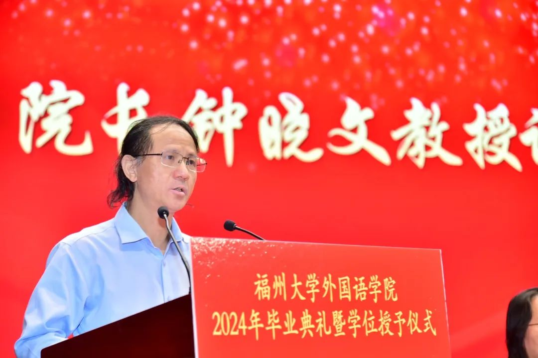 随后2024届优秀毕业生代表张朱琳同学、2024届硕士毕业生代表张誉馨同学、1990级校友代表暨院校友会理事龚俊麟先生、教师代表沈杏轩老师、院长钟晓文教授依次上台发言。