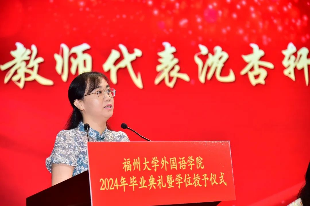 接着,教师代表沈杏轩老师向毕业生们致以毕业祝福,并向同学寄语两点:一是希望同学们不断提升自我学习能力;二是希望同学们微笑面对人生风风雨雨。同时沈杏轩老师也希望毕业后的同学们能够投身到如火如荼的新时代社会主义事业的建设中去。