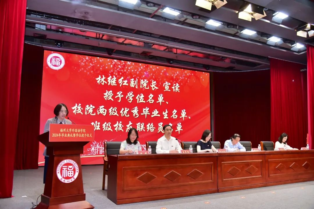 图书馆博学厅隆重举行2024届毕业典礼暨学位授予仪式。外国语学院党委书记程贞玫、院长钟晓文教授、党委副书记蓝荣聪、副院长林继红教授、院长助理赵婧教授、院长助理沈彬副教授、教师代表、家长代表、校友代表及2024届全体毕业生及在校生代表参加毕业典礼。毕业典礼由蓝荣聪副书记主持。