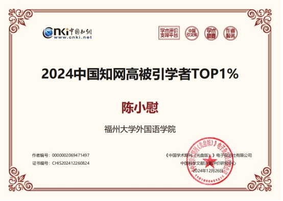 近日,2024年外国语言文学中国知网高被引学者名单正式发布,Av在线观看 陈小慰教授入选TOP1%榜单。