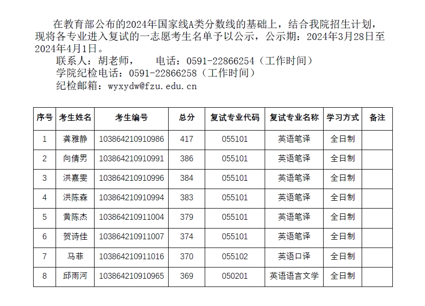 2024年Av在线观看 外国语学院一志愿复试考生名单公示