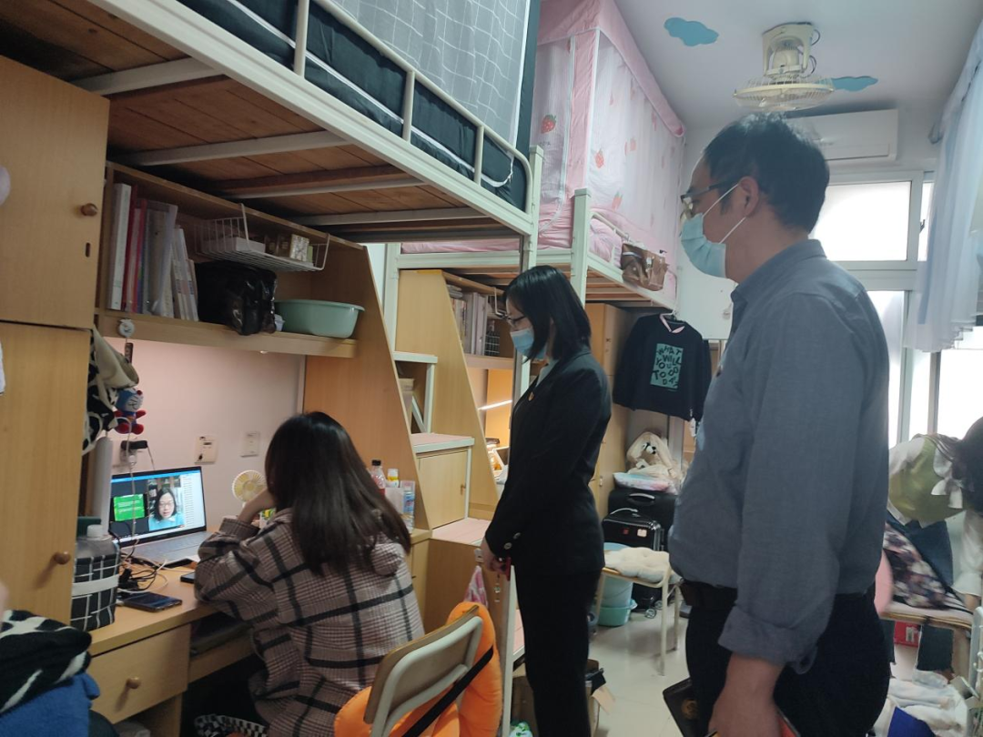 走访过程中,学院领导亲切问候在寝同学,了解宿舍设施设备完善情况,排查宿舍安全隐患,并且询问同学们特殊时期学习以及生活上的不便之处。针对线上学习,程书记提出要及时适应,做好学习规划,认真参与学习,保持规律作息。在与大四学子交谈过程中,程书记详细了解了同学们目前学习、实习状况和未来的规划,并且对同学们提出的疑惑作出了具体的解答。最后,领导们再次强调疫情防控注意事项,提醒同学们加强安全防范意识。