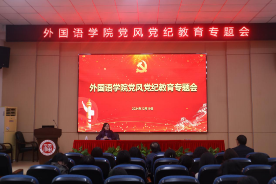 为深入开展党风党纪教育,强化党员干部的纪律意识和廉洁意识,12月19日下午,外国语学院在学院三楼报告厅举行党风党纪教育专题会,会议由学院党委书记程贞玫主持,学院领导钟晓文、蓝荣聪、林继红出席,学院教工党员、教代会代表等参加会议。