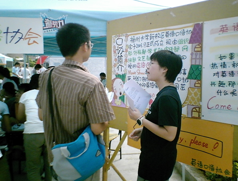 07级同学n的到来给英语角注入了新的血液,开学后第一周,口语协会进行纳新。经过笔试和面试两个环节,07级的王宇辰,付妮,陈雅彬,韩婷婷,王淑铮,吴忆航,陈明雅进入口语协会,并为英语角的各种活动出谋划策。