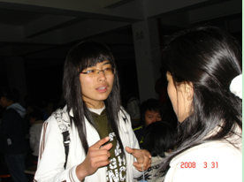 07级预备党员李晓云,王红林,蒋玉梅是日语专业的学生。“作为一名非英语专业的学生,有时觉得有点惰性,毕竟专业课比较重要。但既然选择了学习语言,就一定要学好两者。作为一名党员,在英语角发挥党员的先锋模范作用是我们必须承担的责任之一。而我应先从自身的学习抓起。从自身的学习抓起是在英语角中发挥作用的前提条件,也是自身素质提高的重要条件。其次,作为一名非英语专业的学生,我和我们班的一些同学带头鼓励其他同学去英语角。”(蒋玉梅)