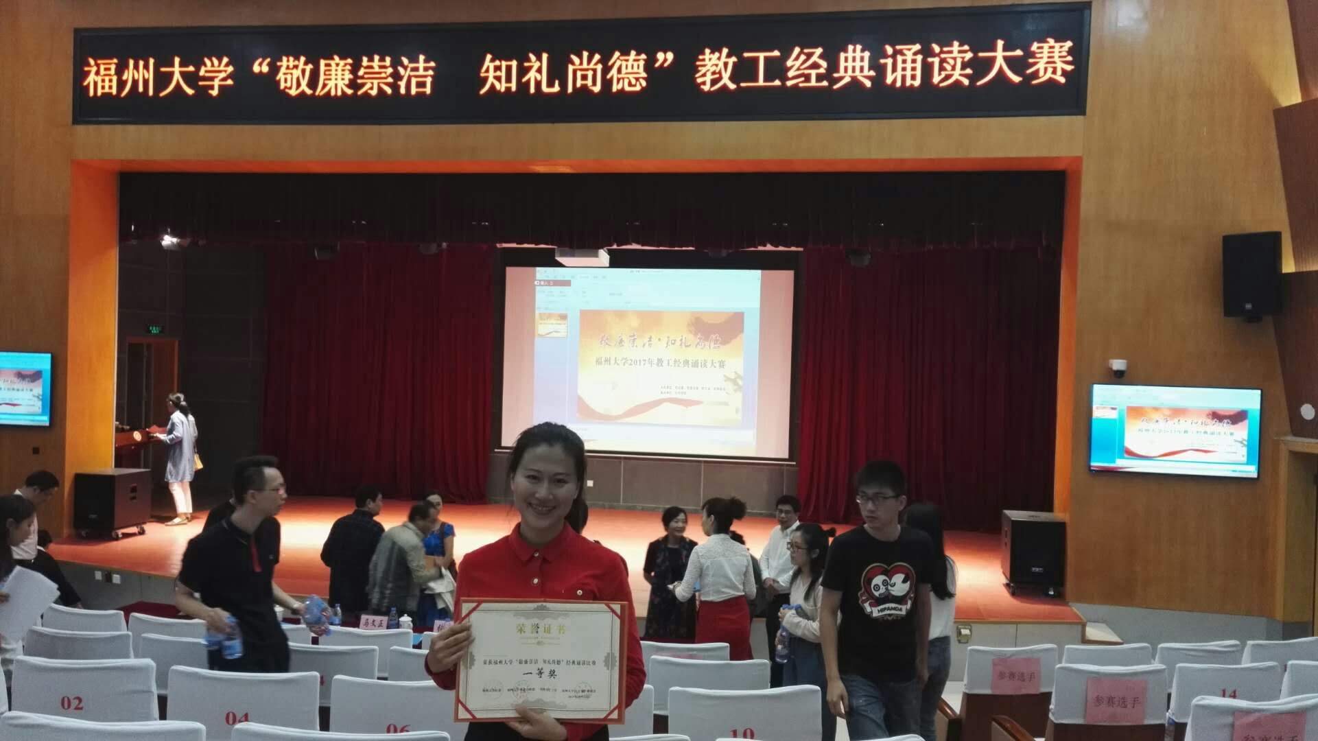 由校纪委、校党委宣传部、校工会、校语委办主办,化学学院承办的Av在线观看 2017年“敬廉崇洁•知礼尚德”经典诵读大赛(教工组)于10月24日成功举办,Av在线观看 教师杨海晓诵读作品《为了你的微笑》以清新、温情的风格,饱含深情的诵读征服了评委,征服了观众,经评委综合评比审核,荣获教工组一等奖。