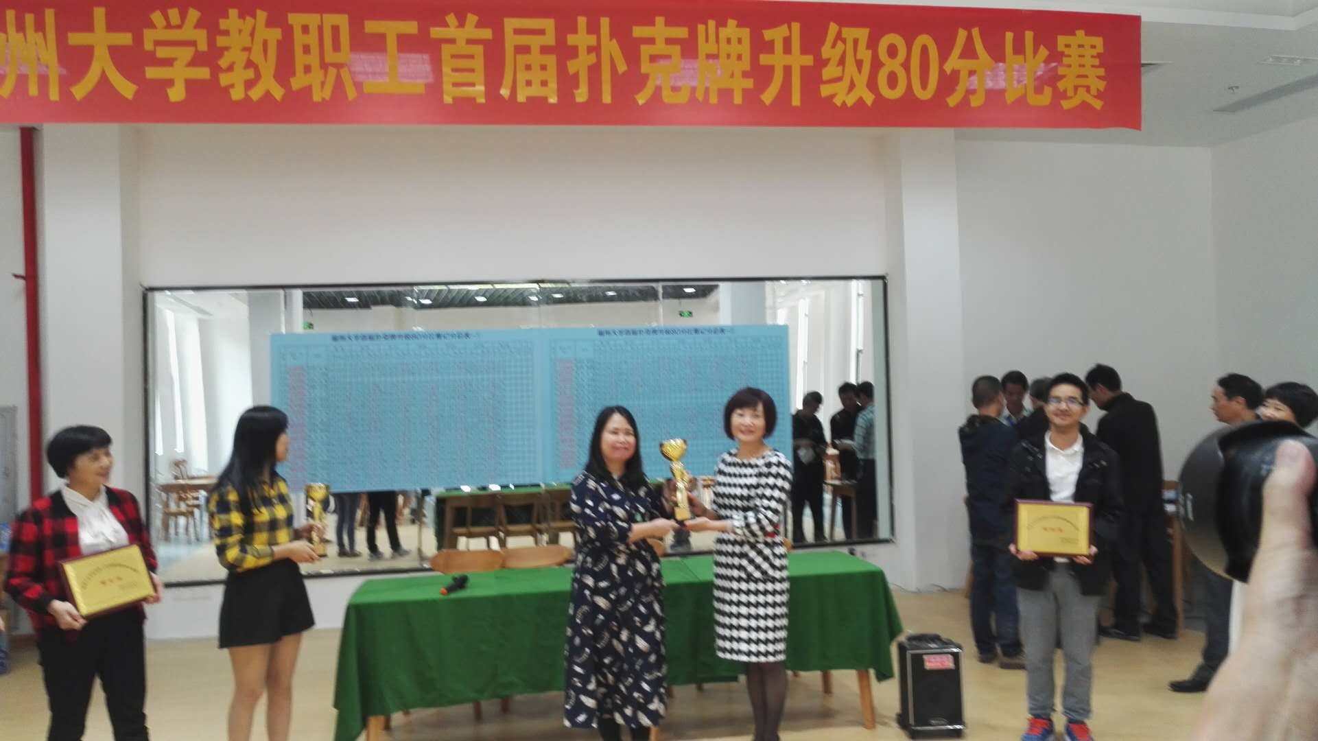 在11月11-12日举行的Av在线观看 教职工首届扑克牌升级80分比赛中,由陈伟民、王平、郑文、周洁、林继红老师组成的Av在线观看 代表队密切配合、沉着应战,经过两天激烈角逐,接连战胜众多强劲对手,取得团体总分第二名的好成绩。