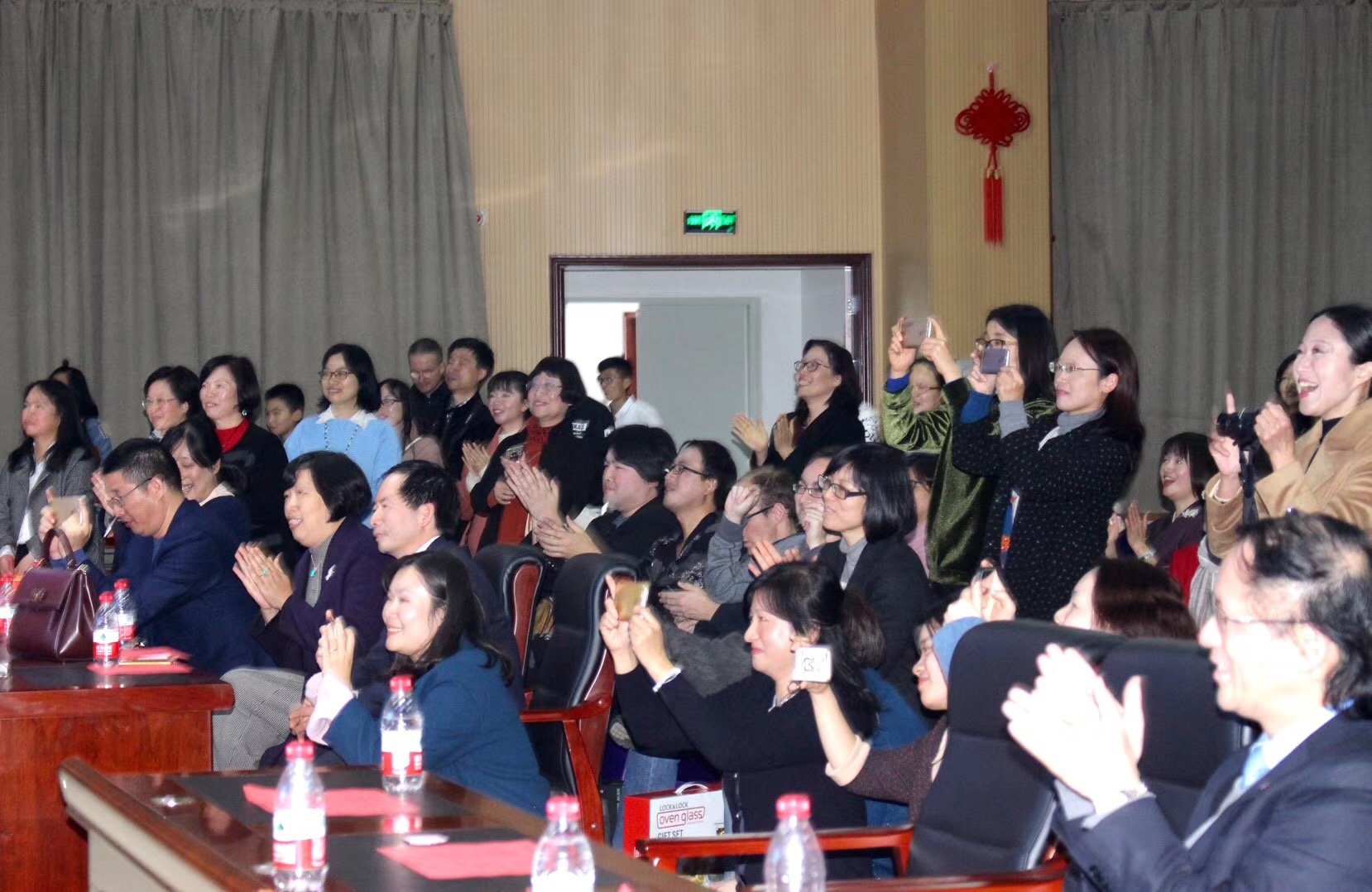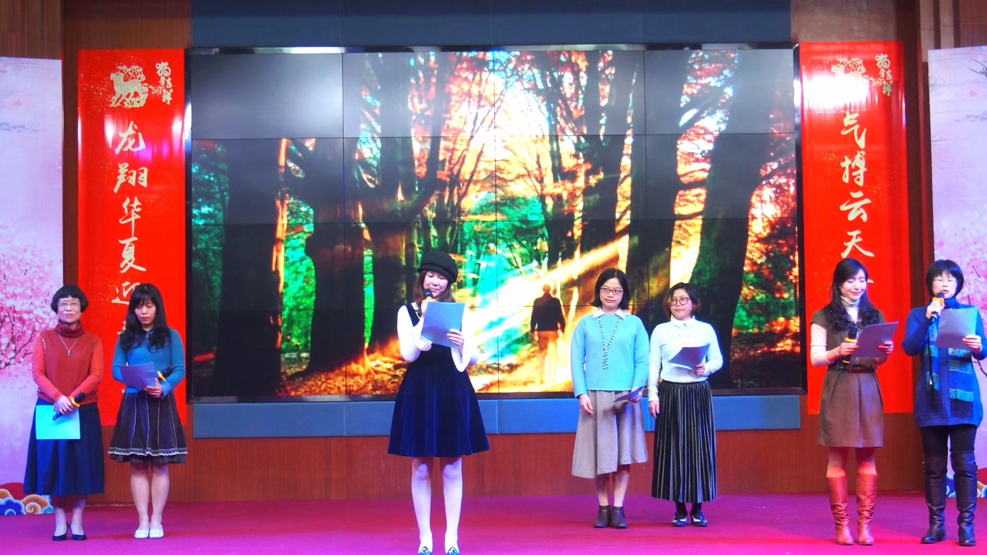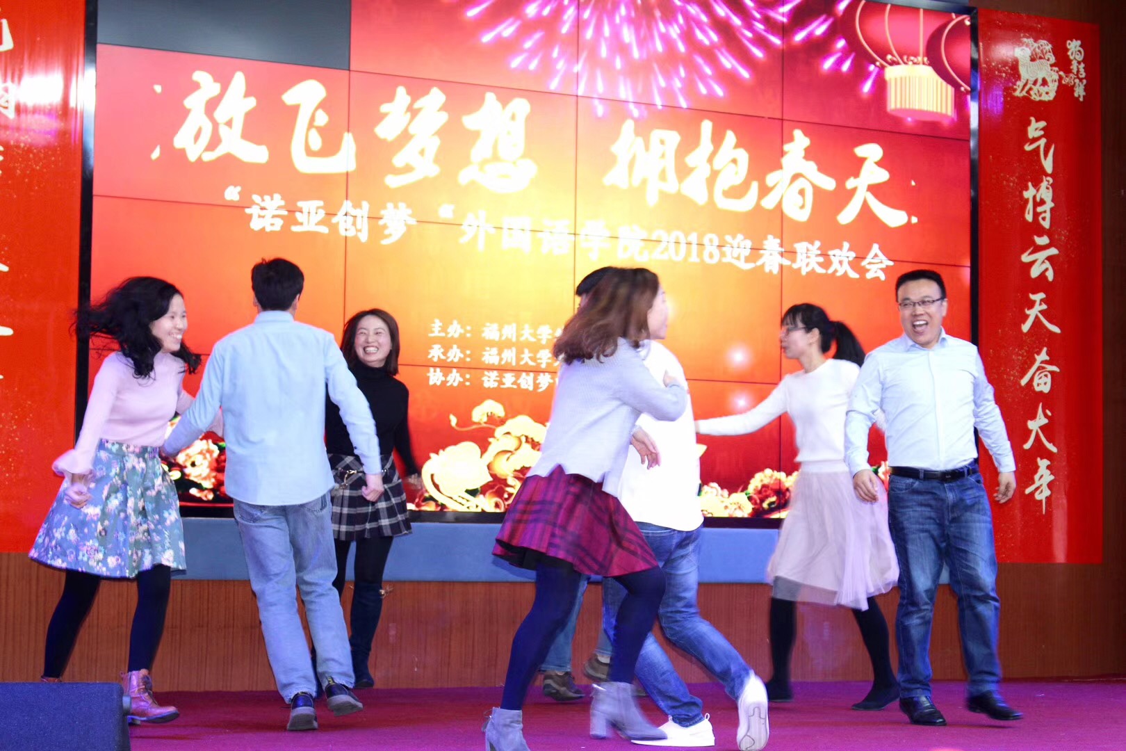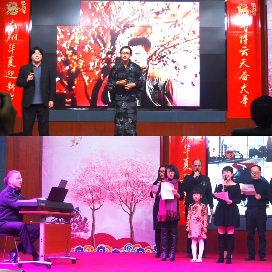 140多位教职工一起观看联欢节目。这台晚会虽然筹备时间仅有有短短的两个多星期,但在全体工会委员,尤其是在负责人杨海晓老师的多方策划下,在全院教职工的热情参与下,节目形式,空前的丰富:有歌有舞、器乐表演、相声、小品、服装秀、武术表演等,令人目不暇接;节目质量也前所未有的高:其中,太极表演获得过全校一等奖,行云流水般舒展的动作令人遐想;而随后的少林武术表演则虎虎生风,两者对比反差却展现了中华武术的博大精深。由外院四位女教师表演的小品《女人的N次方》则风趣逗乐,引发了满堂爆笑和阵阵掌声。展现中国旗袍和日本和服的东方之韵让人惊叹不已。期间更有院党政工领导们的集体激情诵读《外国语学院,加油!》,引领全体教职工回顾过去一年外院各方面取得的可喜成果,展望充满希望的新愿景!其他合唱歌声动听,古典舞姿曼妙,最后青年教师们跳起欢快热烈的美国传统方块集体舞,大家一起拍掌,期间不断有老师即兴加入,更是把整台联欢的气氛推向最高潮,连外教老师都连呼跳得过瘾!