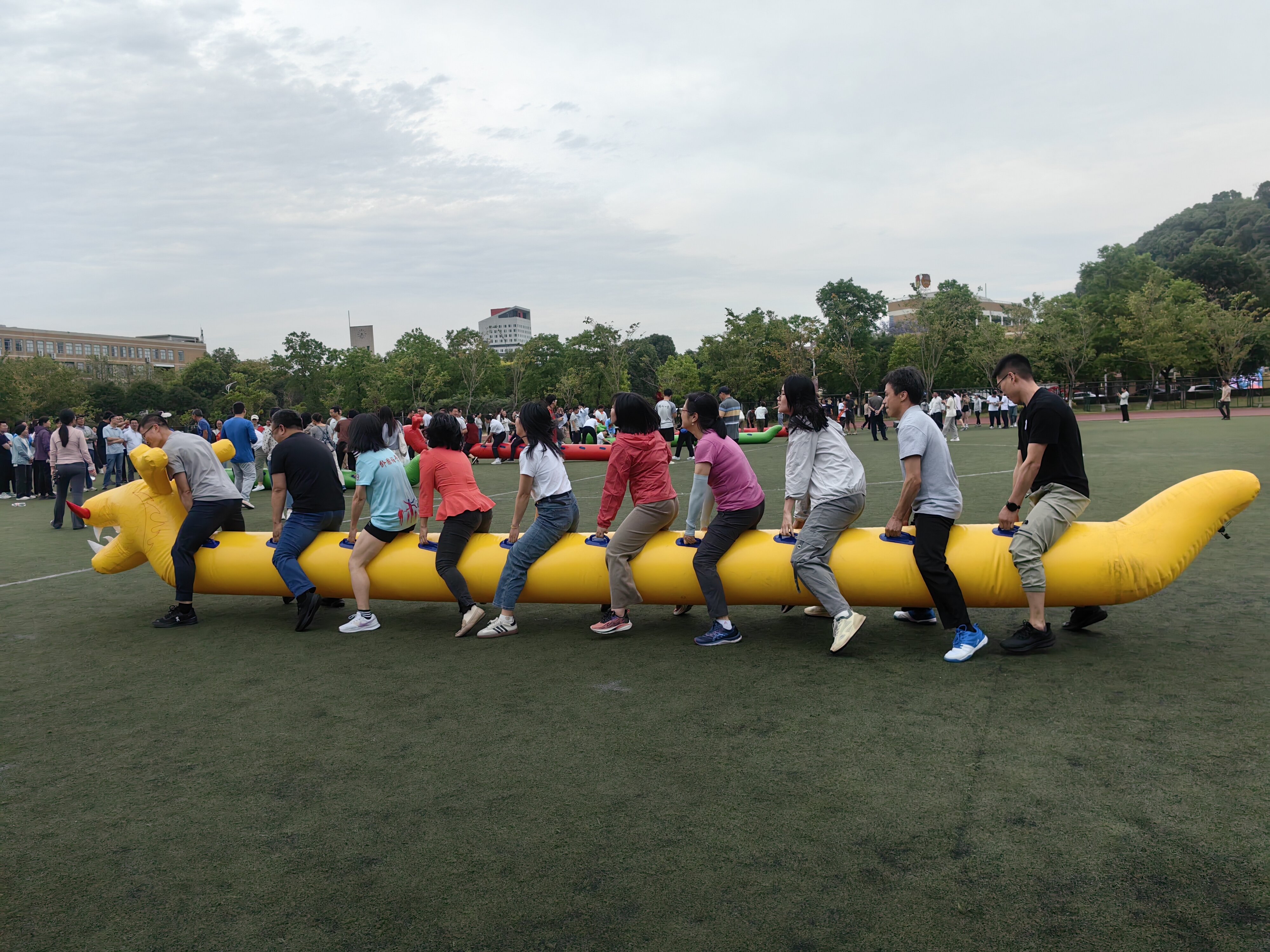 夏日无限好,运动正当时。趣味运动会设有集体跳绳、同舟共济、提绳踏板、龙行天下四个团体项目。“集体跳绳”真是“绳”采飞扬,参赛者们用一次次的跳跃尽情展现运动风采,坚持不懈的拼搏精神令人振奋。“同舟共济”的三名队员默契配合,齐心协力,勇往直前。“提绳踏板”考验四名队员之间的默契配合,他们双手提绳,双脚踏板,在一致的口号声中同步协调向终点冲刺。“龙行天下”十人一组骑游龙,转头、摆尾、直行,挑战的是速度与技巧,更是团队间的默契,龙行龘龘,前程朤朤。
