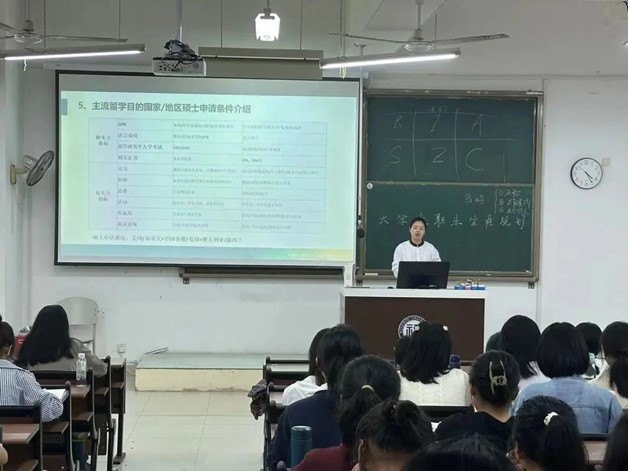分享会伊始,张密玉校友以学习为例强调生涯规划的重要性,提醒同学们注重大学四年的平时积累。通过分析当今本科生的毕业出路和国内考研竞争形势,张老师详细介绍了出国留学的优劣,谈及外国语学院学生在留学申请方面具有的天然语言优势。