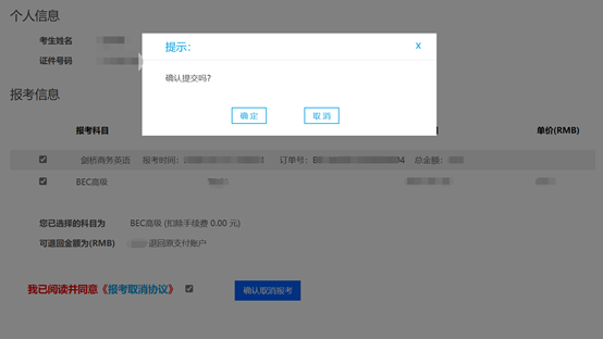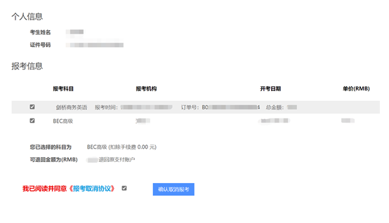 四、进入退费申请页面, 依次勾选“报考信息”、“我已阅读并同意《报考取消协议》”,点击“确认取消报考”