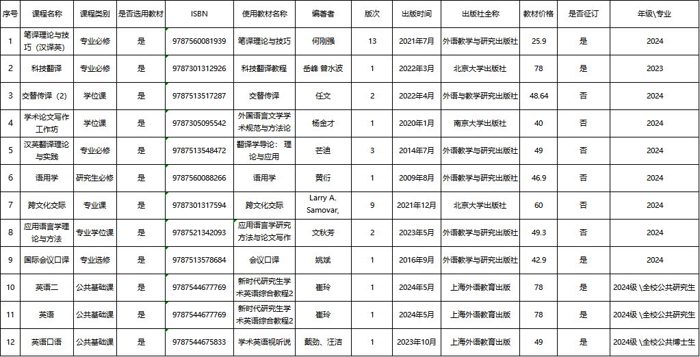 外国语学院2024-2025学年第二学期研究生课程教材选用汇总表